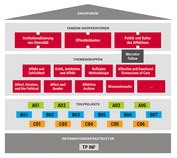Unser interdisziplinärer Verbund hat den Anspruch, multiple Öffentlichkeiten in unsere Forschung einzubinden. Hierzu haben wir verschiedene Arbeitsformate des internen und externen Wissenstransfers entwickelt. Zu der internen Zusammenarbeit gehören seit der ersten Laufzeit die Theorie- und Methodenwerkstatt, die unsere geistes- und sozialwissenschaftlichen Forschungsansätze zusammenführt, ebenso wie die Themengruppen zu projektübergreifenden Aspekten unserer Forschung zu den Kernelementen gelebter Interdisziplinarität. In der dritten Laufzeit wird dies durch jährlich wechselnde Koordinationen der Themenbereiche erweitert. Um den Dialog mit außeruniversitären Akteur:innen und Kooperationen mit Forscher:innen anderer Einrichtungen zu fördern, haben wir weitere Formate des Wissenstransfers entwickelt. Dazu zählen neben einem hauseigenen Podcast, einem Wissenschafts-Blog und einem neuen Online-Glossar auch die Wissenschaftskommunikation im Projekt Öffentlichkeitsarbeit sowie das Web Lab zu Affekt und Kolonialismus.